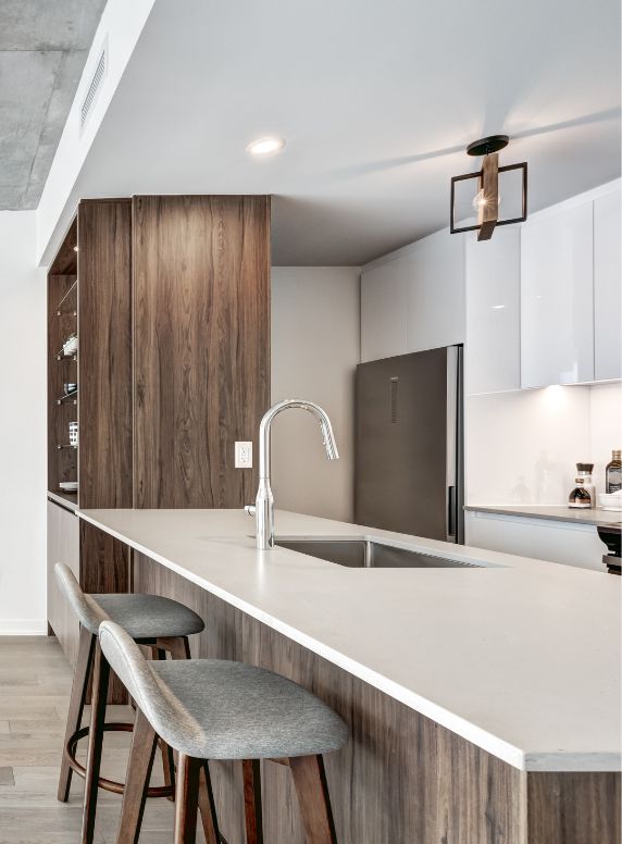 Que ce soit pour la rénovation d’armoires de cuisine, une construction neuve, un multilogement ou un projet commercial, l’équipe d’Ébénisterie du Canton est à votre écoute. Nous concevons du mobilier sur mesure, adapté à votre espace et selon vos préférences.